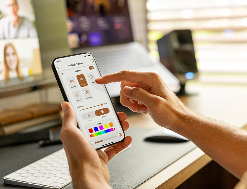 Potencie o seu sistema com a aplicação para computador Klipsch Control. Disponível em todas as lojas de aplicações, a Klipsch Control permite um controlo preciso do equalizador, da iluminação e de funcionalidades como o modo noturno e o modo de reação à música. Três opções de mudança de cor permitem uma maior personalização da iluminação do seu espaço de trabalho.